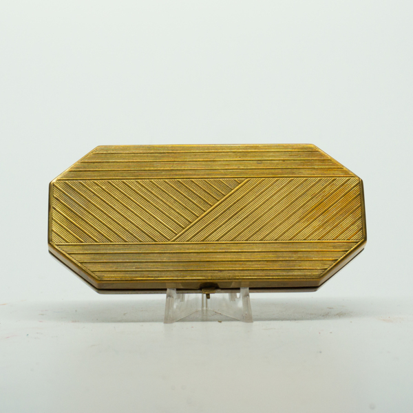 A geometric and floral motif embossed on a rectangular brass compact. The compact has a clasp closure. Inside are two powder wells and puffs opposite a mirror the entire width of the top. A paper insert reads, "DuBarry Compact Powder / Refillers…