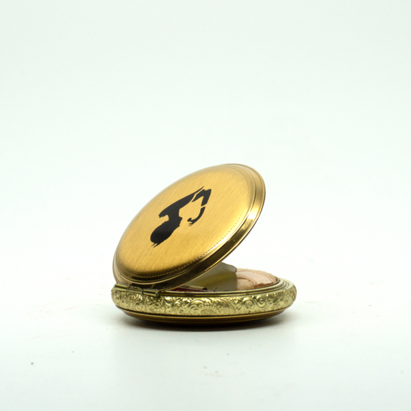 A circular brass compact featuring a black enamel feminine figure on its top. The compact has a clasp closure and opens to reveal a rouge, puff and mirror the entire width of its top. The puff has a silk strap printed with text reading, "Elgin."