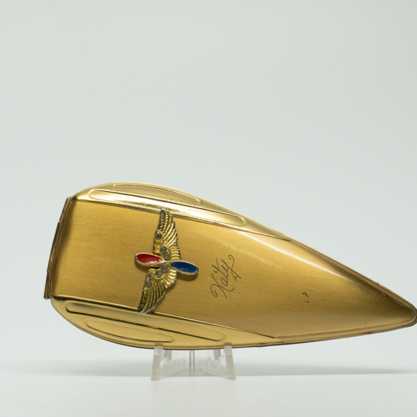 A teardrop-shaped brass compact with a small central set of eagle wings. There are two ovals at the center of the wings. The ovals are red and blue enamel surrounded by simulated diamonds. Under the wings the wings, the compact is engraved with the…