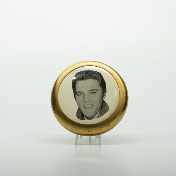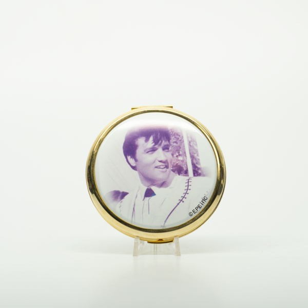 A circular, brass compact featuring a photo of Elvis Presley on the top. The compact opens on a hinge. Inside, there is a mirror the width of the top of the compact and a light orange-pink puff with a satin strap. The bottom of the compact has a…