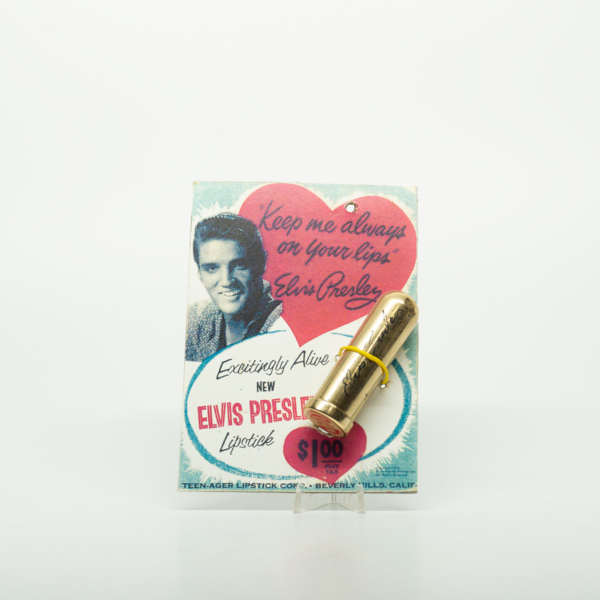 A brass lipstick tube in cardboard packaging featuring a photo of Elvis Presley. The cardboard reads, "Keep me always on your lips. - Elvis Presley / Excitingly Alive / New / Elvis Presley Lipstick / $1.00 plus tax / Teen-Ager Lipstick Comp. Beverly…