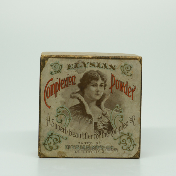 A rectangular container printed in red, brown and blue featuring a feminine figure at its center surrounded by filigree on its lid. Text reads, "Elysian Complexion Powder / Superb beautifier for the complexion / Manf'd by Elysian M'F'G Co., Detroit…