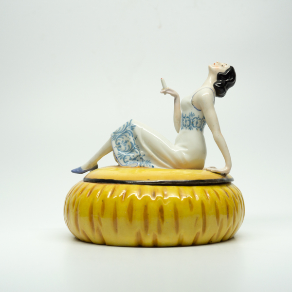 A feminine figure wearing makeup dressed in a nightgown smoking a cigarette while reclining on a cushion. The lid can be lifted from the base to access the inside of the jar.