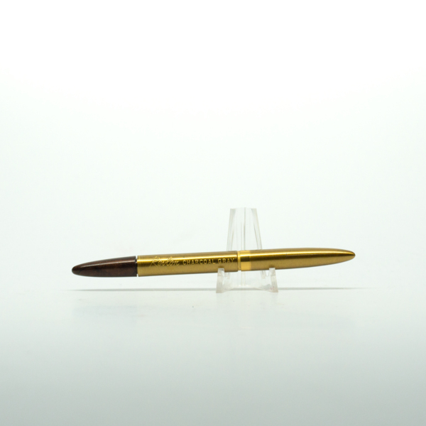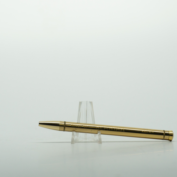 A brass pencil with a wheel at the end to adjust the length of the product. The pencil is engraved with three crowns, then text reading, "Scandia / Brown."
