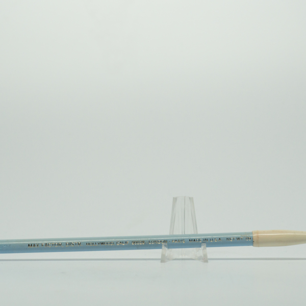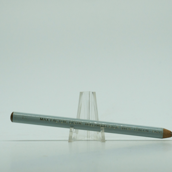 A light blue wooden eyeliner pencil with silver embossed text reading, "424 / Max Factor, Distr. / Hollywood Calif. 90028 / London - Paris / Made in U.S.A. / Net. Wt. .09oz." The white cap covers a sharpened tip of the waxy pencil.