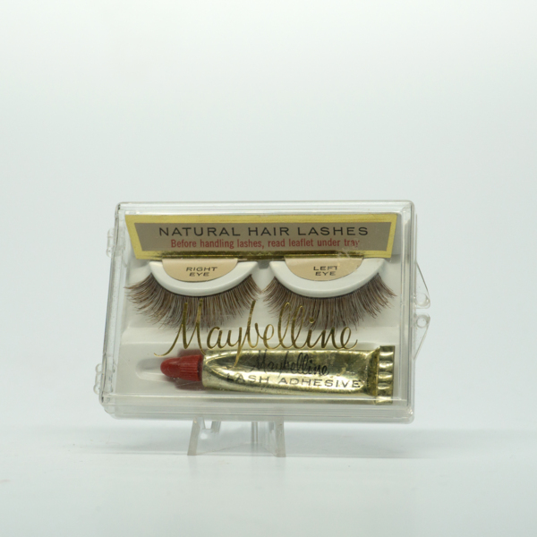 A rectangular plastic container holding a set of false eyelashes and eyelash glue. Text above the lashes reads, "Natural Demi Lashes / Before handling lashes read leaflet under tray / Right Eye / Left Eye." The back of the container is illustrated…