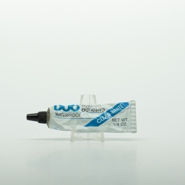 An aluminum tapered squeeze-tube with a plastic twist off lid. The tube has white, black and blue graphics. The front of the tube contains the shade name and the brand, "Duo / eyelash adhesive / waterproof / clear-white / Net. Wt. 1/4 oz." The back…