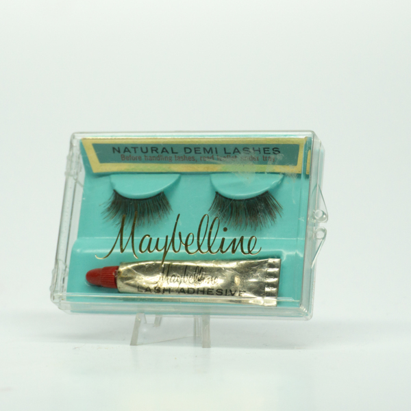 A rectangular plastic container holding a set of false eyelashes and eyelash glue. Text above the lashes reads, "Natural Demi Lashes / Before handling lashes read leaflet under tray." The back of the container is illustrated with an eye wearing…