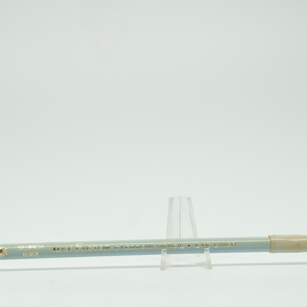 A light blue pencil with a plastic cap. The pencil is stamped, "Muted Auburn / Max Factor / Eyebrow Pencil / Eyeliner."