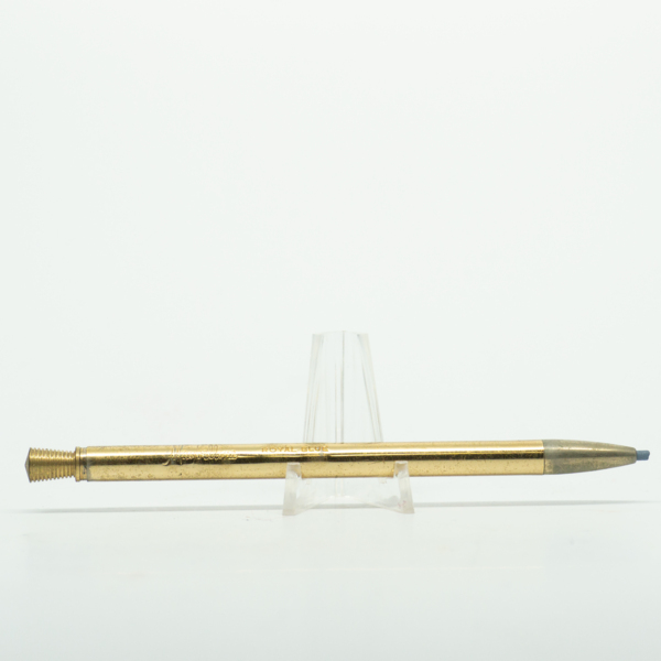 A brass pencil with a twist up cream eyeliner. The side of the pencil is stamped, "Max Factor Hollywood / Brownish Black."