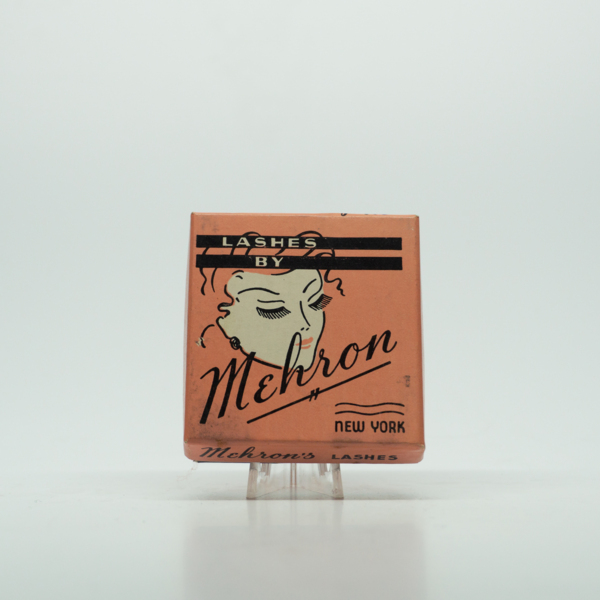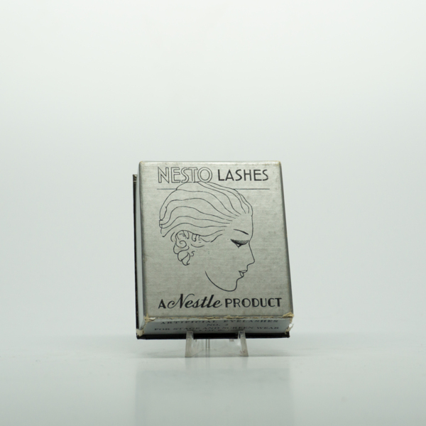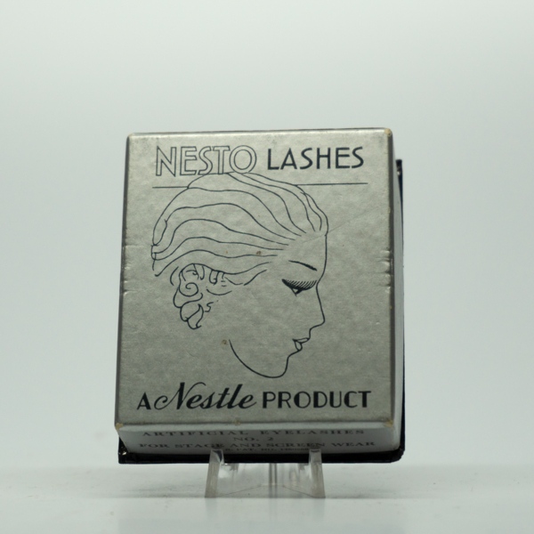 A silver rectangular cardboard container printed with a feminine figure and text reading, "Nesto Lashes / A Nestle Product." The side of the container reads, "Artificial Eyelashes / No. 2 / For Stage and Screen Wear / U.S. Patent No. 1450259." The…