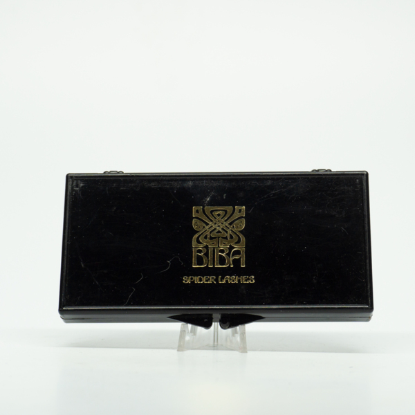 A black plastic case with the Biba logo on the top center. The case opens on a hinge with a clasp. Inside there is a pair of false eyelashes and a tube of eyelash glue. The bottom of the case is printed with gold text reading, "Spider Lashes / One…