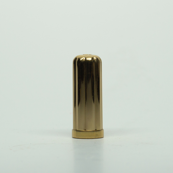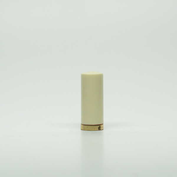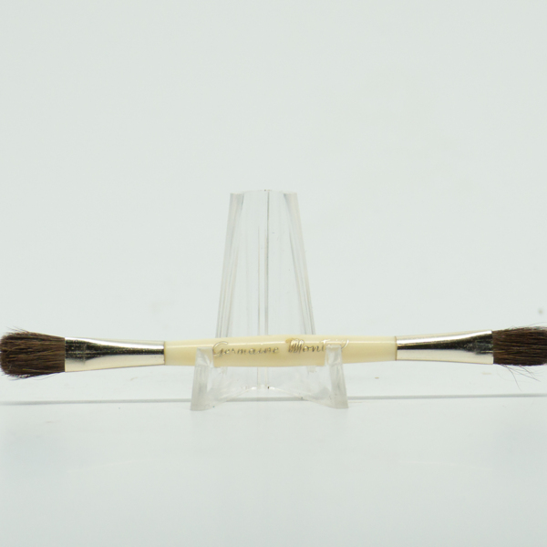 A brass lipstick tube with a cream plastic lid. "GM" is printed on its top. The bottom of the brass tube is engraved, "Germaine Monteil / New York Distributor."