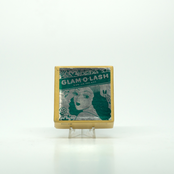 A tan cardboard box with a blue metallic, "Glam O Lash / Reg. U.S. Pat. Off.," Sticker featuring a feminine figure on a floral background. Once the lid is removed, the false eyelashes can be accessed. On the edge of the top lid is the shade name,…