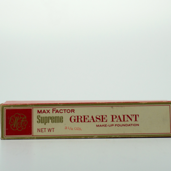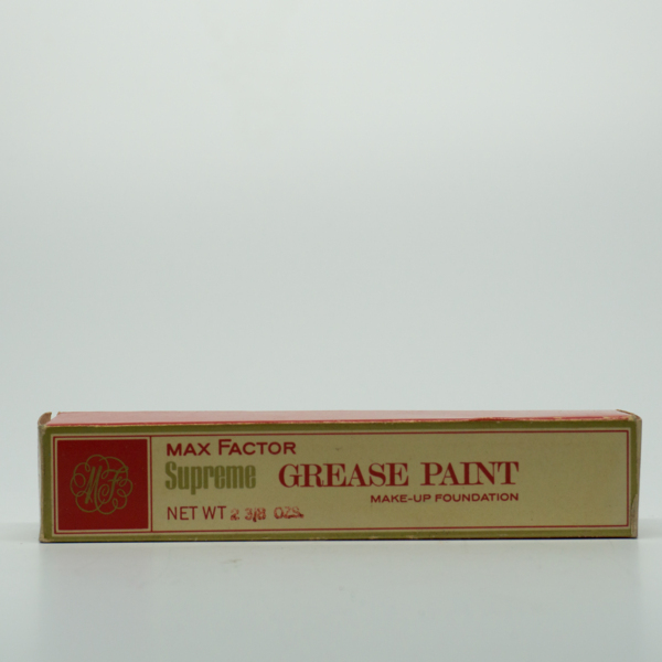 A cardboard box with red and green graphics. The front reads, "Max Factor Supreme / Grease Paint / Make-Up Foundation / Net Wt. 3 1/4 oz." The back reads, "The use of cold cream before applying is not necessary. Simply dab on sparingly. Then spread…