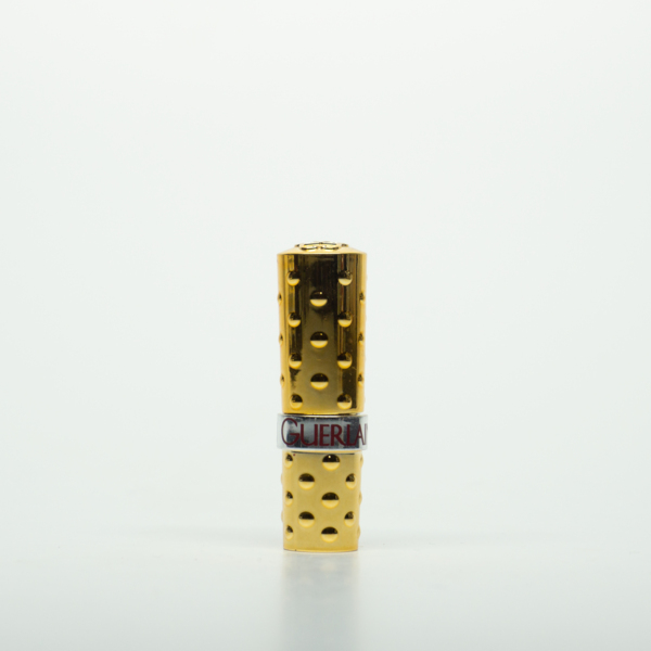 A gold, plastic lipstick tube with a circular texture covering the tube. A smooth, silver band at the middle of the tube reads, "Guerlain," in red text. The lipstick can be accessed by removing the top and twisting the bottom. The shade label on theā¦