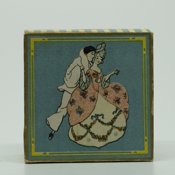 A three piece powder box containing: an external box, pamphlet and product container. The external box and the product container have identical images of a dancing couple. A yellow and blue stripe is consistent in all three elements. Text on theā¦
