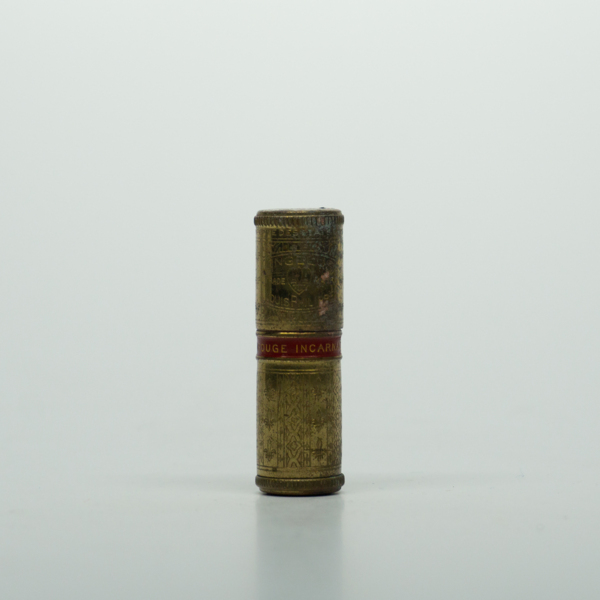 A small, round brass lipstick engraved with text reading "Louis Phillipe / Trade Mark." A burgundy enamel stripe around the middle of the tube with gold text reads, " Rouge Incarnangelus." The bottom of the tube has a black shade label with white…
