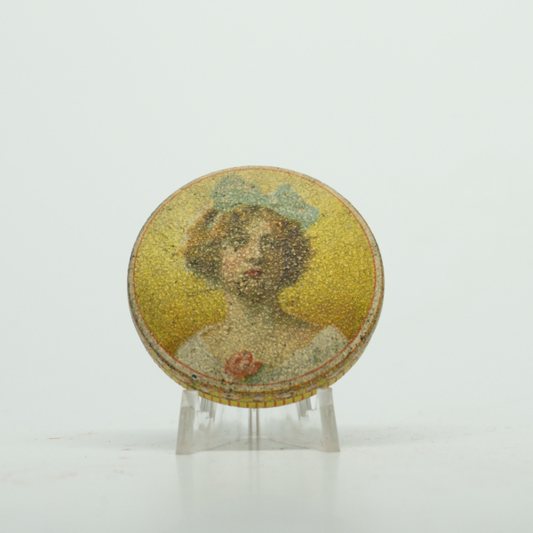 A yellow, peach, blue and green circular tin featuring a feminine figure at the center. The bottom of the container is printed with a geometric heart-shaped design around its perimeter. Text at the center reads, "Assorted beauty spots / Manufactured…