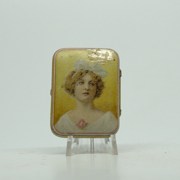 A white, peach and yellow rectangular tin container featuring a feminine figure at the center of the top. The bottom of the container is printed with geometric heart-shaped design around its edges. Text at the center reads, "Assorted beauty spots /…