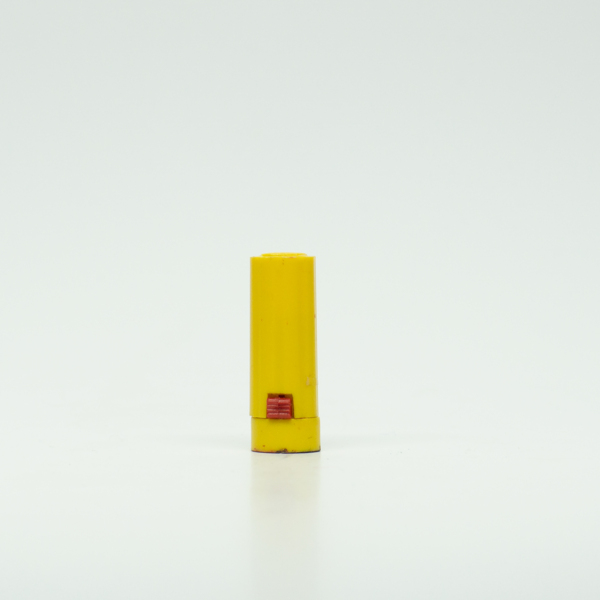 A flat,round yellow plastic lipstick with the brand, "Khasana," stamped on its top. The lipstick can be accessed by removing the cap and sliding up the outer, red, button. A shade label on the bottom of the tube reads, "Khasana / 1 / Superb."