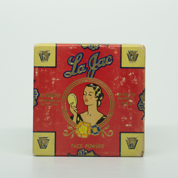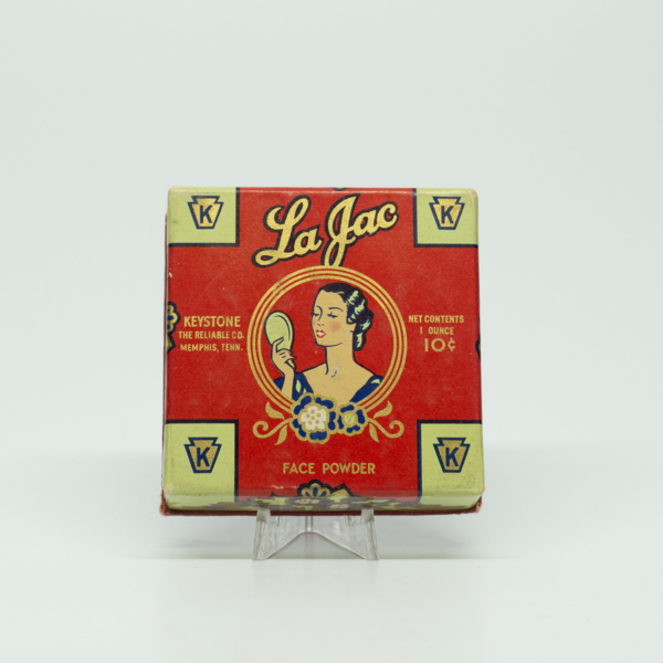 A yellow, red and blue printed powder box featuring a feminine figure in its center with floral and filigree details. Text reading, "La Jac / Face Powder / Keystone The Reliable Co. Memphis, Tenn. / Net Contents 3 1/2 ounces 25c.," surrounds the…