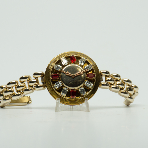 A bracelet with simulated diamonds and rubies on a false watch face. The watch face opens to reveal a compact with a mirror the full diameter of the false watch face. Opposite the mirror is a powder well, sifter and paper insert and puff. The bottom…