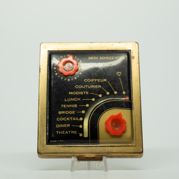 A round brass compact with a compass style mechanism adjustable to daily activities the owner may participate in below a small adjustable clock. The compact opens on a hinge with a finger ridge. Inside is a mirror and powder well. The bottom of the…