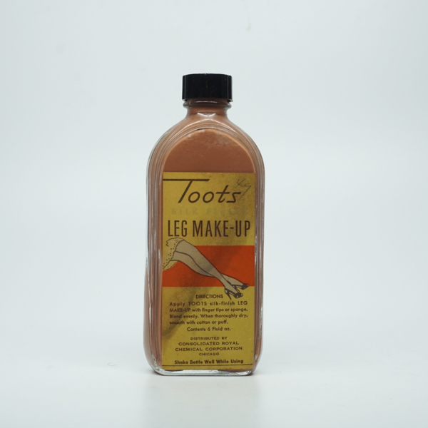 A rectangular glass bottle with a rounded top and black plastic screw lid. The white, yellow and red graphics on the paper label feature a set of crossed legs and text reading, " Toots / Silk Film / Leg Makeup / Directions / Apply Toots Silk-Finish…