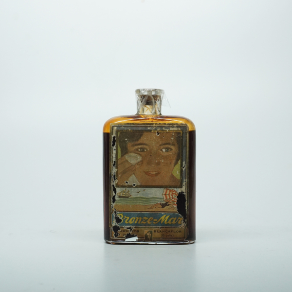 A rectangular glass bottle with a plastic screw top. A paper label on the front of the bottle features a pair of legs and black text reading, "Leg Makeup by Marinello / Distributed by Sales Affiliates, Inc. / 730 Fifth Ave. New York / Contents 6 fl.…