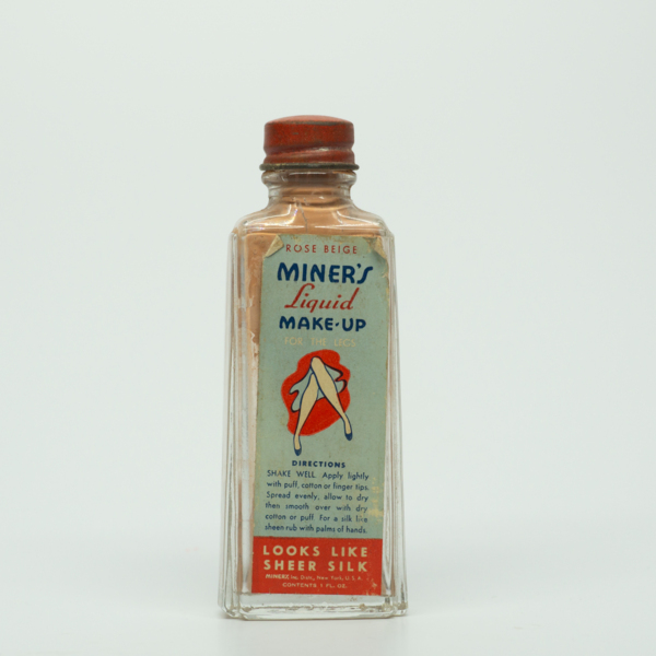 A tapered rectangular bottle with a red tin top. A paper label with red white and blue graphics featuring crossed leg under a skirt. The text on front of the bottle reads, "Rose Beige / Miner's / Liquid Make-Up / For the Legs / Directions / Shake…