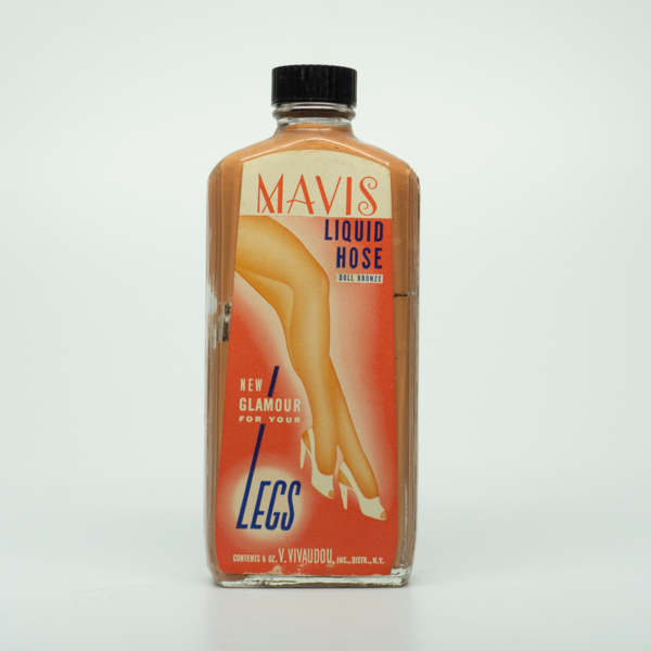 A rectangular glass bottle with a black plastic screw top. The paper label on the front features red white and blue graphics with text reading, "Mavis Liquid Hose / Dull Bronze / New glamour for your legs / contains 6 oz. V. Vivaudou, Inc. Distr.…