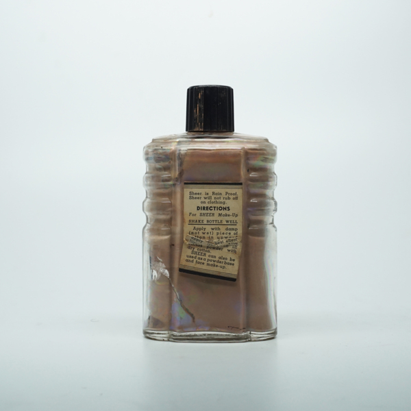 A round glass bottle with concentric rings near its top. The bottle is closed with a plastic screw top. A paper label on the front of the bottle features a pair of legs under red and white text reading, "Contents & Ounces / Sheer Leg Make Up /…