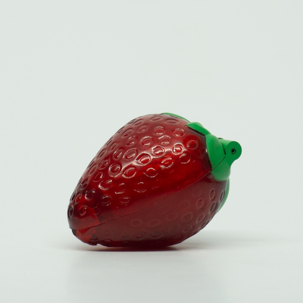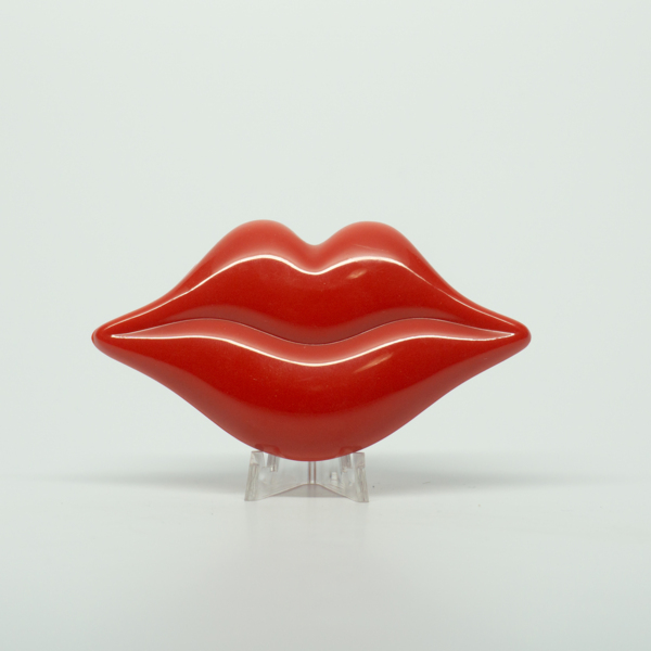 A red plastic lip shaped lip gloss container. The container opens on a hinge with a finger ridge. A shade label is stamped into the bottom of the container reading, "Lip gloss / Pink/Peach / Apply with fingertip / Avon Products, Inc. New York N.Y.…