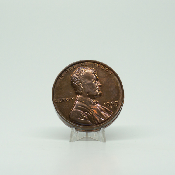 A plastic bronze U.S. Penny shaped lip gloss. The top and bottom are stamped to resemble the currency. To access the lip gloss the top of the penny twists off. A shade label on the bottom reads, "Lip Gloss / Coral/Rose / Apply with fingertip / Avon…