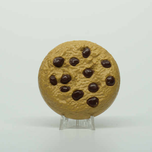 A plastic light and dark brown cookie shaped lip gloss. To access the lip gloss, the top of the cookie twists off. A shade label stamped on the bottom reads, "Lip Gloss / Clear Chocolate/Dark Chocolate / Apply with fingertip / Avon Products Inc.,…