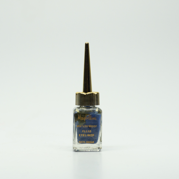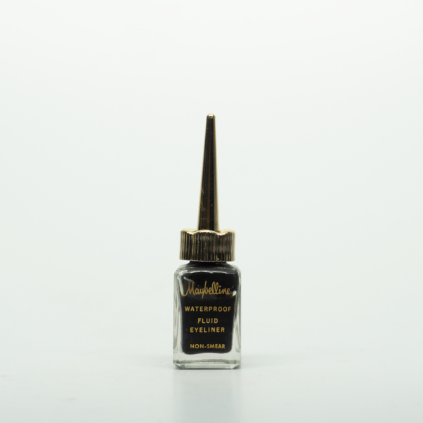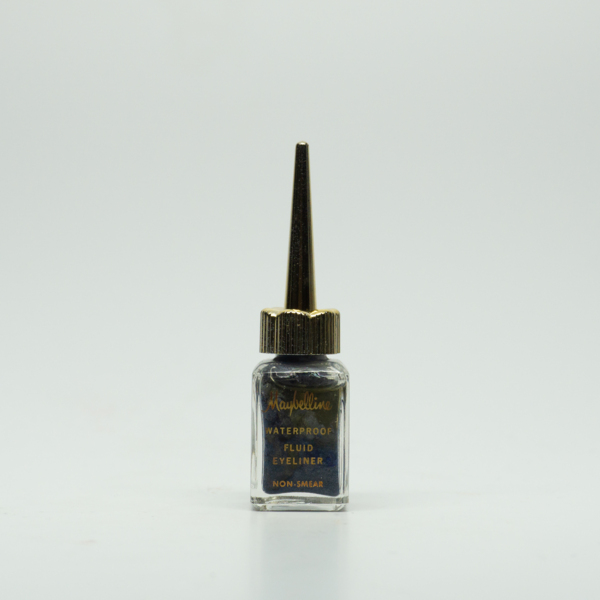 A rectangular glass bottle with a gold, tapered top and enamel text reading, "Maybelline Waterproof Fluid Eyeliner / Non-Smear." The back of the bottle reads, "Shake well before using. Apply smooth line close to lashes. If liner turns thick add…