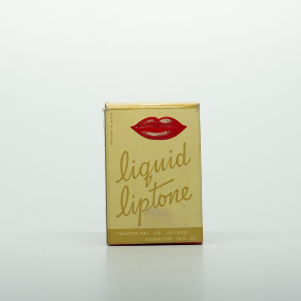 A beige box with gold and red graphics. Text reading, "Liquid Liptone," is beneath an illustration of red lips. The bottom of the box reads, "U.S.A. Patents No. 22300063. 2158901 / Foreign Patents Pending." Inside the box is a small glass vial with a…