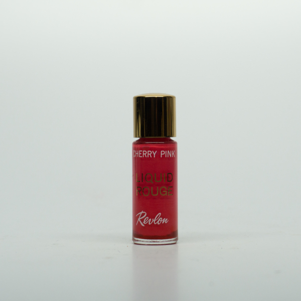 A glass vial with a plastic lid. The vial has white and gold enamel text reading, "Cherry Pink / Liquid Rouge / Revlon / Shake Well / Quickly blend a drop of liquid rouge over skin with fingertips use after makeup base, but before powder. Revlon…