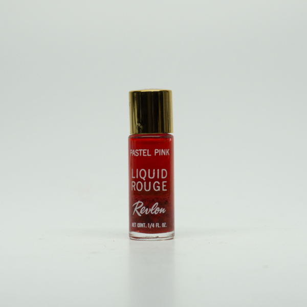 A glass vial with a plastic lid. The vial has white enamel text reading, "Pastel Pink / Liquid Rouge / Revlon / Net. Contents 1/4 Fl. Oz / Shake Well / Quickly blend a drop of liquid rouge over skin with fingertips use after makeup base, but before…