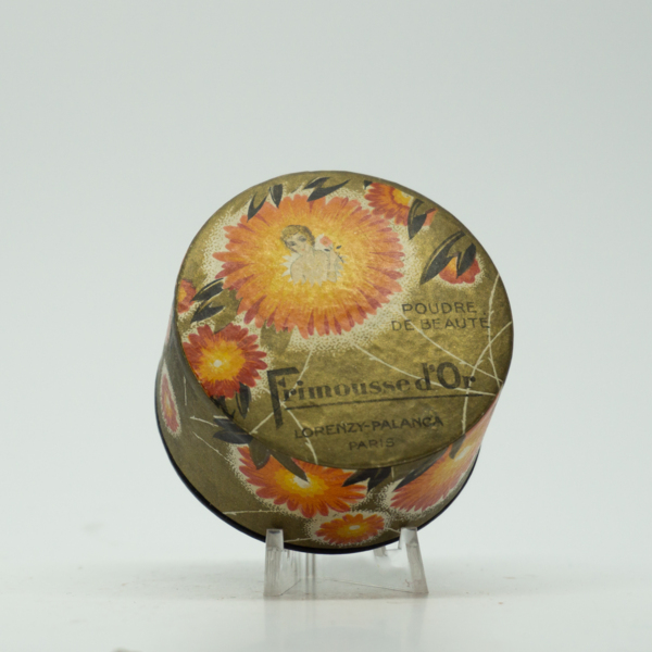 A circular yellow, orange, black and red container with a floral motif. Inside a large flower on its lid is a feminine figure. Text on its top reads, "Poudre / Frimousse d'Or / Lorenzy-Palanca / Paris."