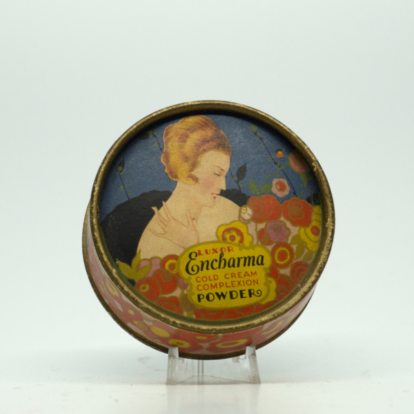 A circular container featuring a full color print on its lid featuring a feminine figure surrounded by graphic flowers. Text below the figure reads, "Luxor / Encharma / Cold Cream Complexion Powder." Additional text wraps around the side among more…