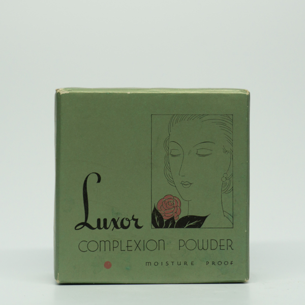A rectangular container with a pink, black and teal lid. A framed graphic image of a feminine figure holding a rose sits to the right of text reading, "Luxor Complexion Powder / Moisture Proof." A shade label on the bottom reads, "Luxor Complexion…