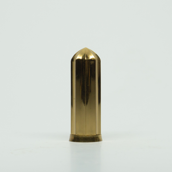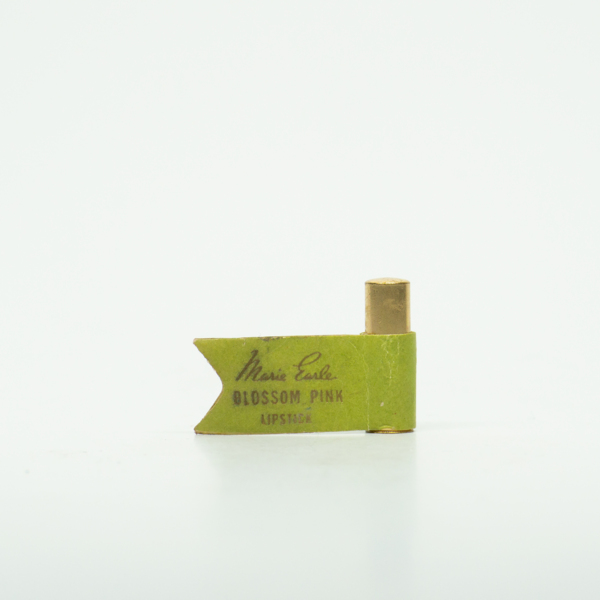 A brass cylindrical, bullet-shaped lipstick tube. Once the top is removed, the lipstick can be accessed by twisting the bottom. A label at the bottom reads, "Blossom Pink," surrounded by engraved text, "Marie Earle / Rallet Corp. Sole Distributor…