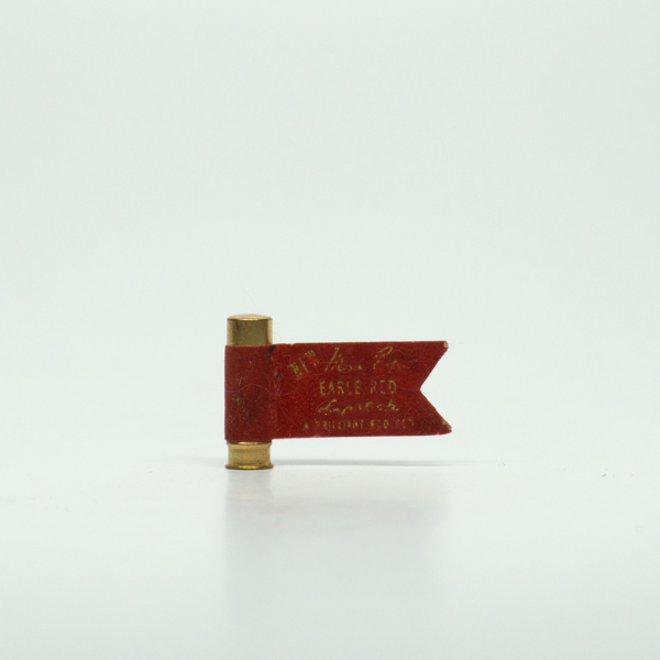 A small, brass lipstick sample with original red felt flag backing with gold text reading, "New Marie Earle / Earle Red / Lipstick / A Brilliant Red Red."