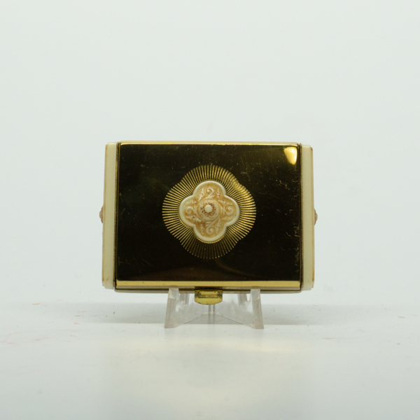 A rectangular brass compact with a central floral design featuring a simulated pearl accent. The compact also has simulated pearl accents on its sides. The compact opens on a hinge with a finger clasp. Inside, there is a powder well and puff printed,…