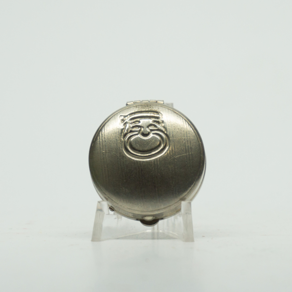 A round tin embossed with a Max Factor logo. The container opens on a hinge with a finger clasp. Inside, is a product well opposite a mirror the entire width of the lid. Text on the bottom reads, "Max Factor Society / Grey."