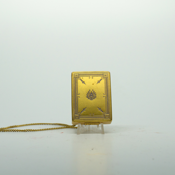 A gold rectangular double compact engraved with filigree inlaid with light purple pigment. The compact opens on a hinge with a finger clasp. Inside, is a lipstick tube engraved, "Melba," and a powder well with a purple silk puff matching the pigment…