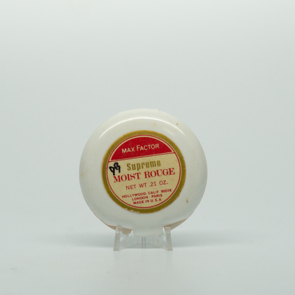 A white round plastic compact with a label attached. The label has yellow and red graphics, and it reads, "Max Factor / Supreme / Moist Rouge / Net. Wt. .21 oz. / Hollywood Calif. 90028 / London - Paris / Made in U.S.A." The Compact opens on a hinge.…