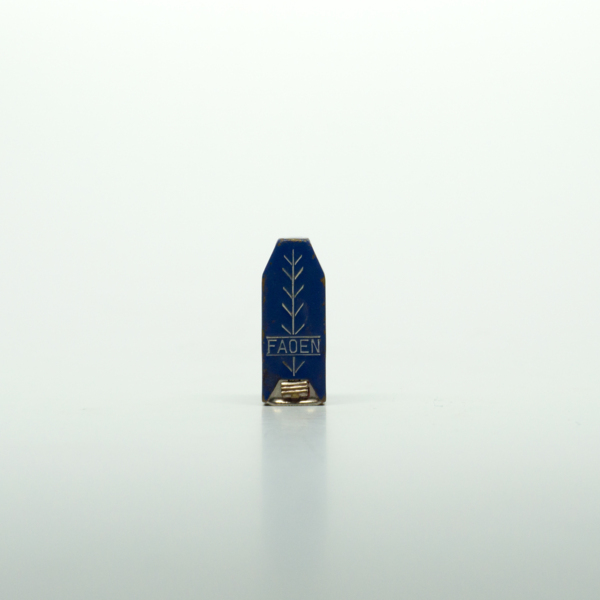 A blue, rectangular, tapered, aluminum lipstick tube with text reading, "Faoen," on its lid below a linear graphic design. The lipstick can be accessed by removing the top and sliding up the outer button.